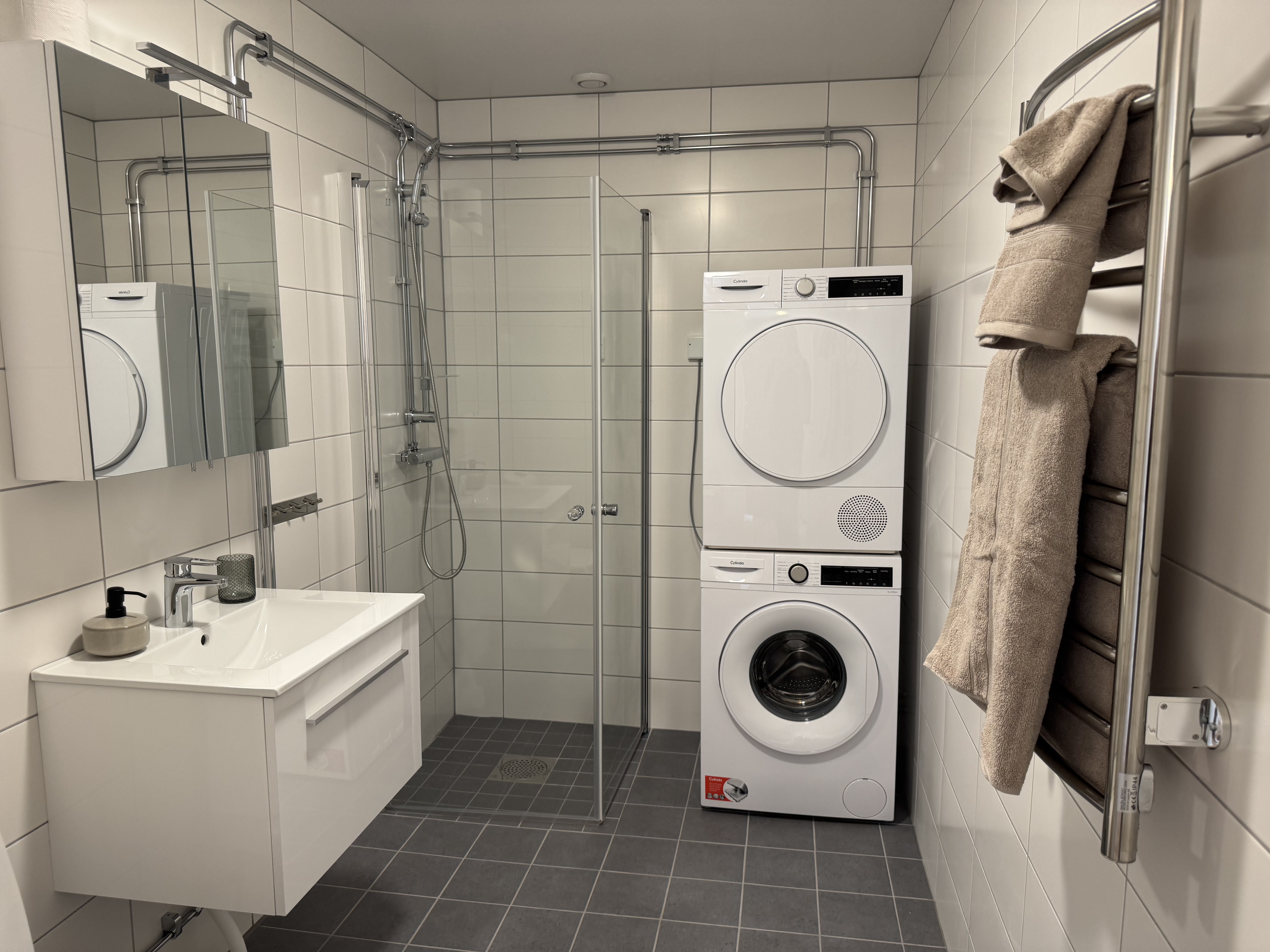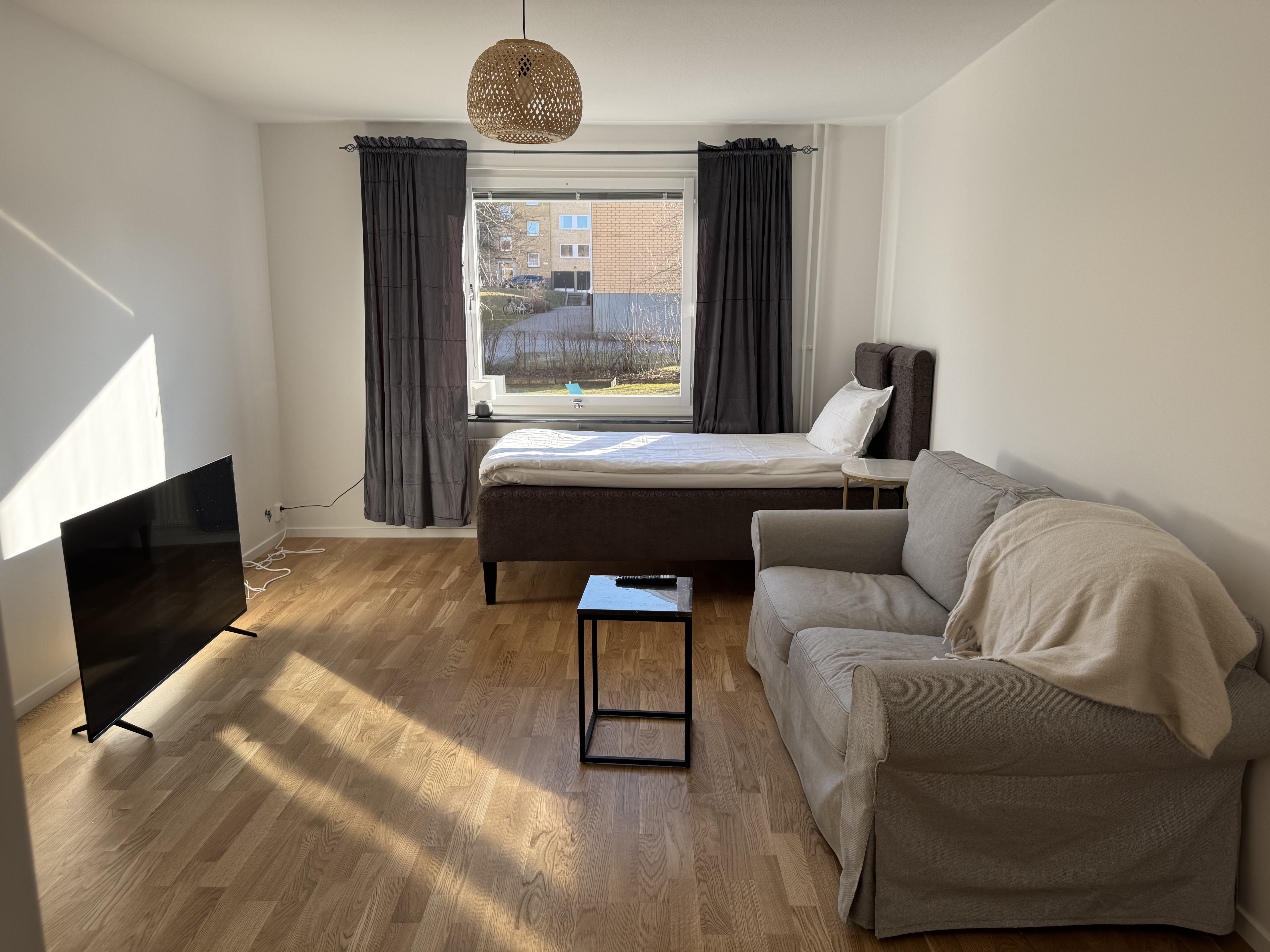 Stor och ljus 1 rum och kök. 1 stor kingzise säng med bra förvaringsmöjligheter. Fullt utrustat kök med diskmaskin. Stort helkaklat badrum med tvättmaskin och handdukstork. Smart Tv med stort kanalutbud och en fin soffa. 1000 mbit/s Wifi.